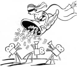 Wir hören unseren Filmemacher hereinkommen und sehen von unten das Gesicht eines mißgelaunten Kommissionsmitglieds, das sich seiner Nachbarin zuwendet und ihr etwas ins Ohr flüstert. Die Nachricht wird zum nächsten weitergeflüstert. Offensichtlich eine abschätzige Beurteilung des Antragstellers. Die Beurteilung erreicht den Kommissionsvorsitzenden, der am übellaunigsten dreinschaut. Er lehnt sich abwartend zurück und verschränkt die Arme.